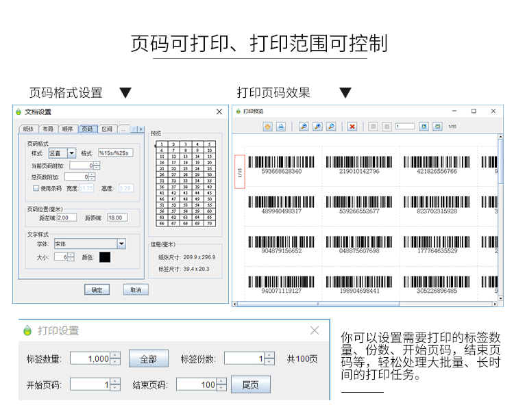 2.可打印页码.页码位置(左、上、右、下)可选择,页码字符串格式可自定义,页码字体颜色,大小可设置.
