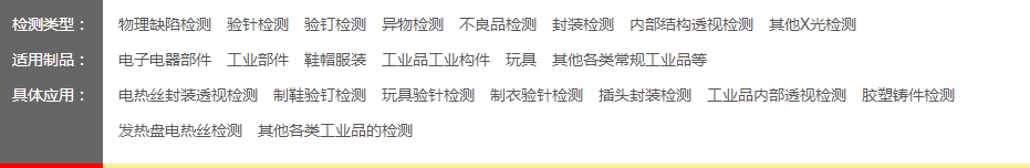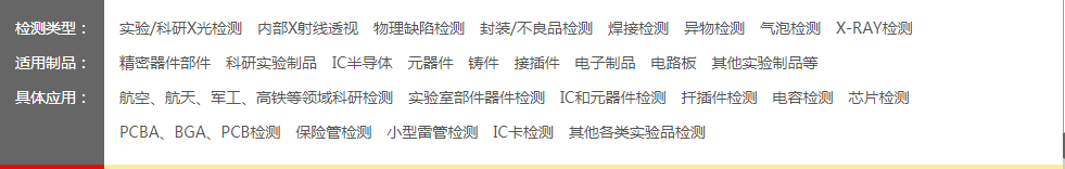 主要针对电子产品、电子元件、电器部件、电子材料、/磁性材料、超导材料、连接器、电热管、内部密度结构是否变形、空焊、移位、气孔、气泡等 .