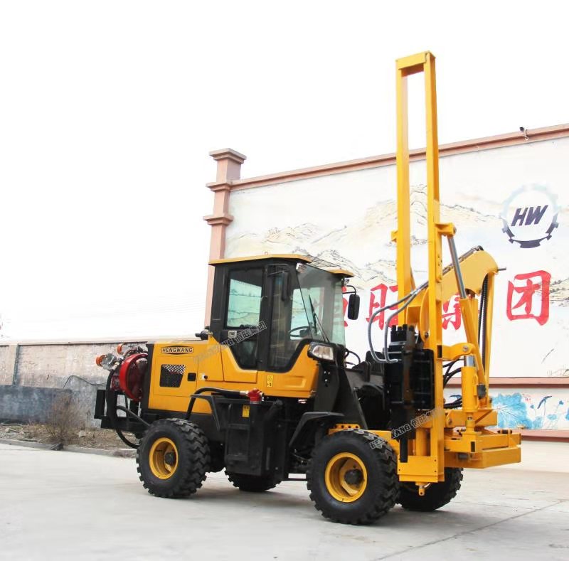 装载机式护栏打桩机是恒旺集团根据市场需求和自身技术成熟的情况下向客户需求而研发的一款产品,是集装载、打桩、钻孔等功能为一体的新型产品。采用全新设计理念、精心研制整体功能,结构模块化兼顾的设计思想,全封闭各木式安装结构,更利于产品快速安装和转场,可广泛运用于公路、高速等路面护栏的桩孔钻进工作。