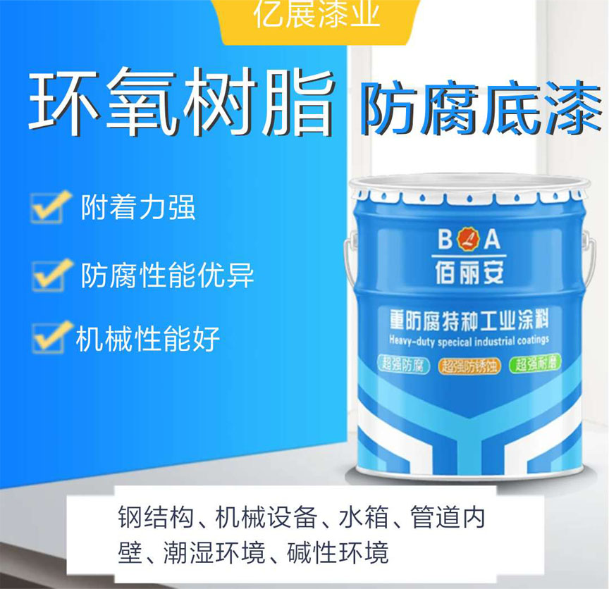 亿展漆业生产的环氧树脂防腐漆附着力强,具有良好的机械性能,耐磨、柔韧、抗冲击性,常温自干,也可烘烤固化,装饰性好,面漆颜色多样,装饰优异,光泽度可调,提升工件的美观性。而且环氧树脂防腐底漆具有导电性和阴极保护作用,粘结力强因此耐腐性能优异、机械性能好、附着力强。