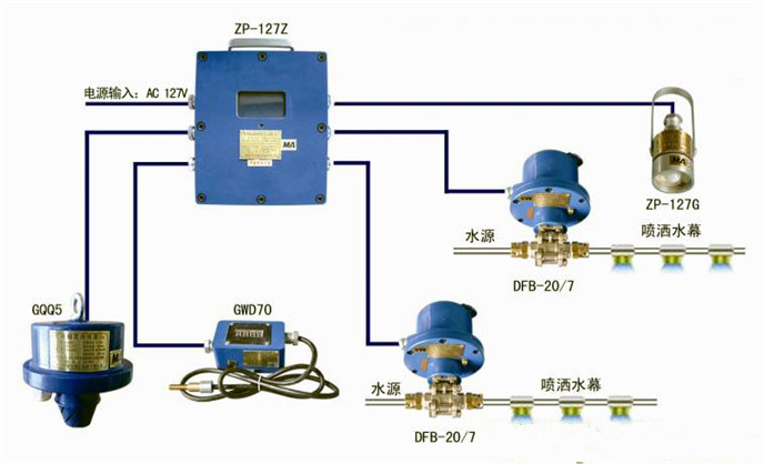 本装置通过烟雾传感器、温度传感器给洒水主控箱信号,来控制电磁阀的通断在特殊部位进行喷洒,达到防尘、防火的目的。在皮带机开启或皮带有物料时进行机头和机尾的防尘,皮带机停止或无物料时,延时一段时间(可调)自动停止喷雾洒水。