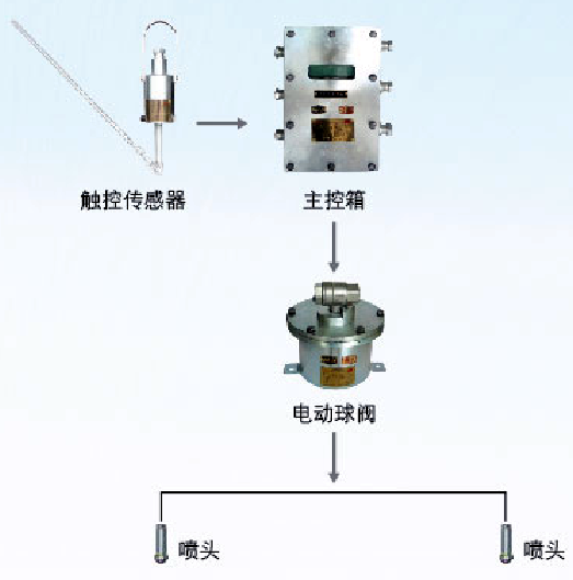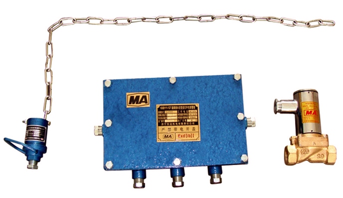 用于巷道口的隔火、防灭火喷雾。主要设备:主控箱1台、烟雾传感器1台、温度传感器1台、电动球阀1台。