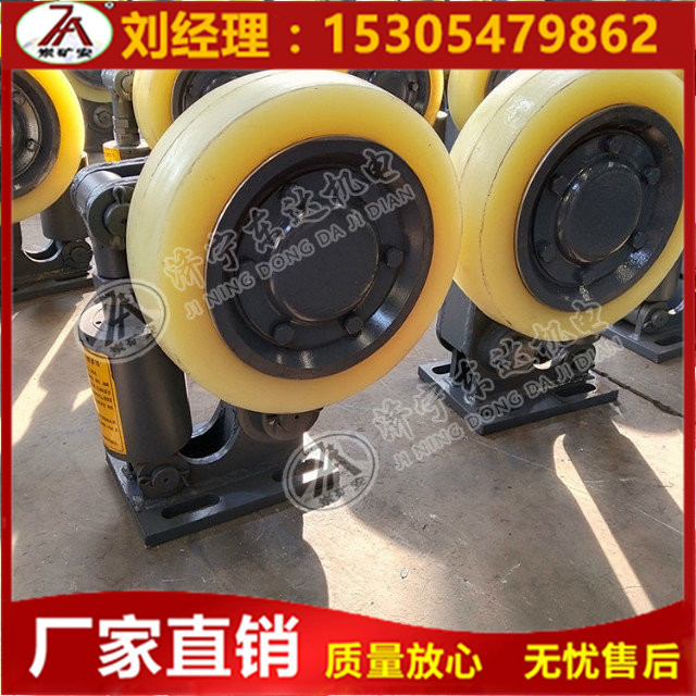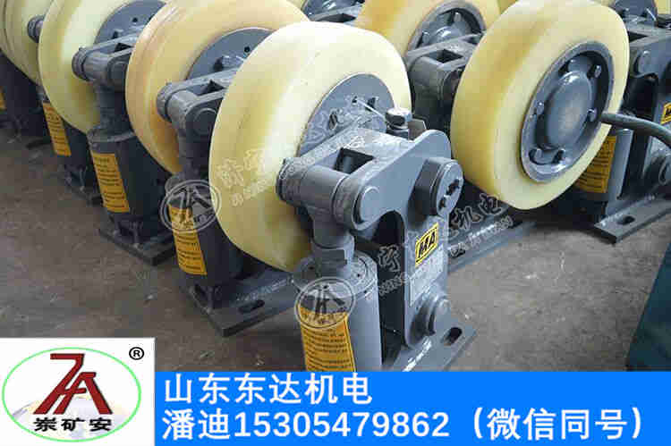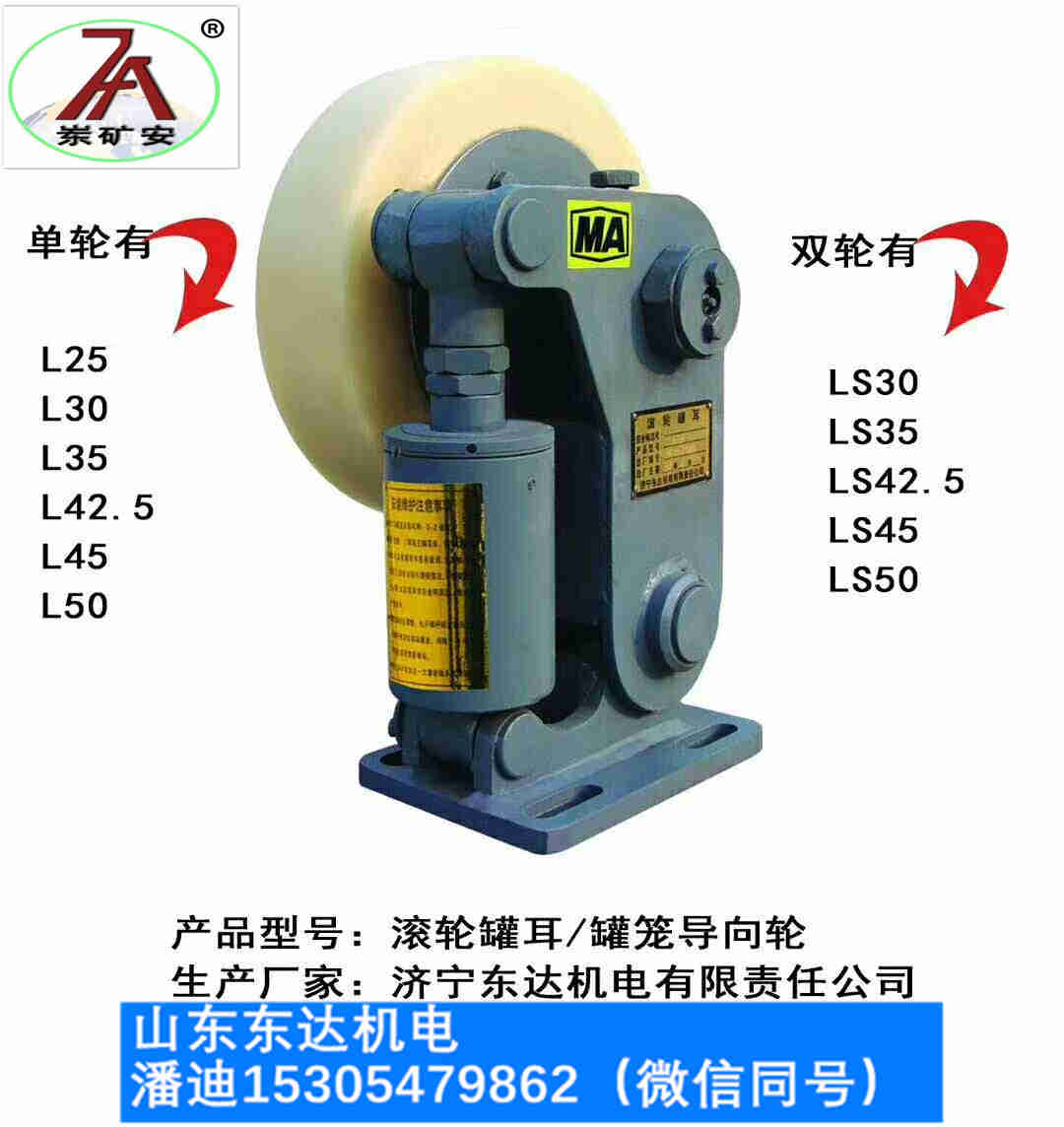 滚轮罐耳为一种立井提升容器,其结构由底座、摆转臂、滚轮、缓冲器组成;滚轮罐耳结合我国矿山特点为目前运行中的提升容器更换新型滚轮导向装置提供了便利条件,广泛应用与矿山,煤炭等工业生产部门。滚轮采用四氢呋喃-环氧丙烷共聚型聚氨酯浇注,具有高弹性、耐撕裂、抗水性、抗油性的优点。滚轮磨损补偿调节采用左、右旋螺杆,调节迅速便捷。机座、摆架采用优质钢板焊接成型,体积小、重量轻,安装轻便。